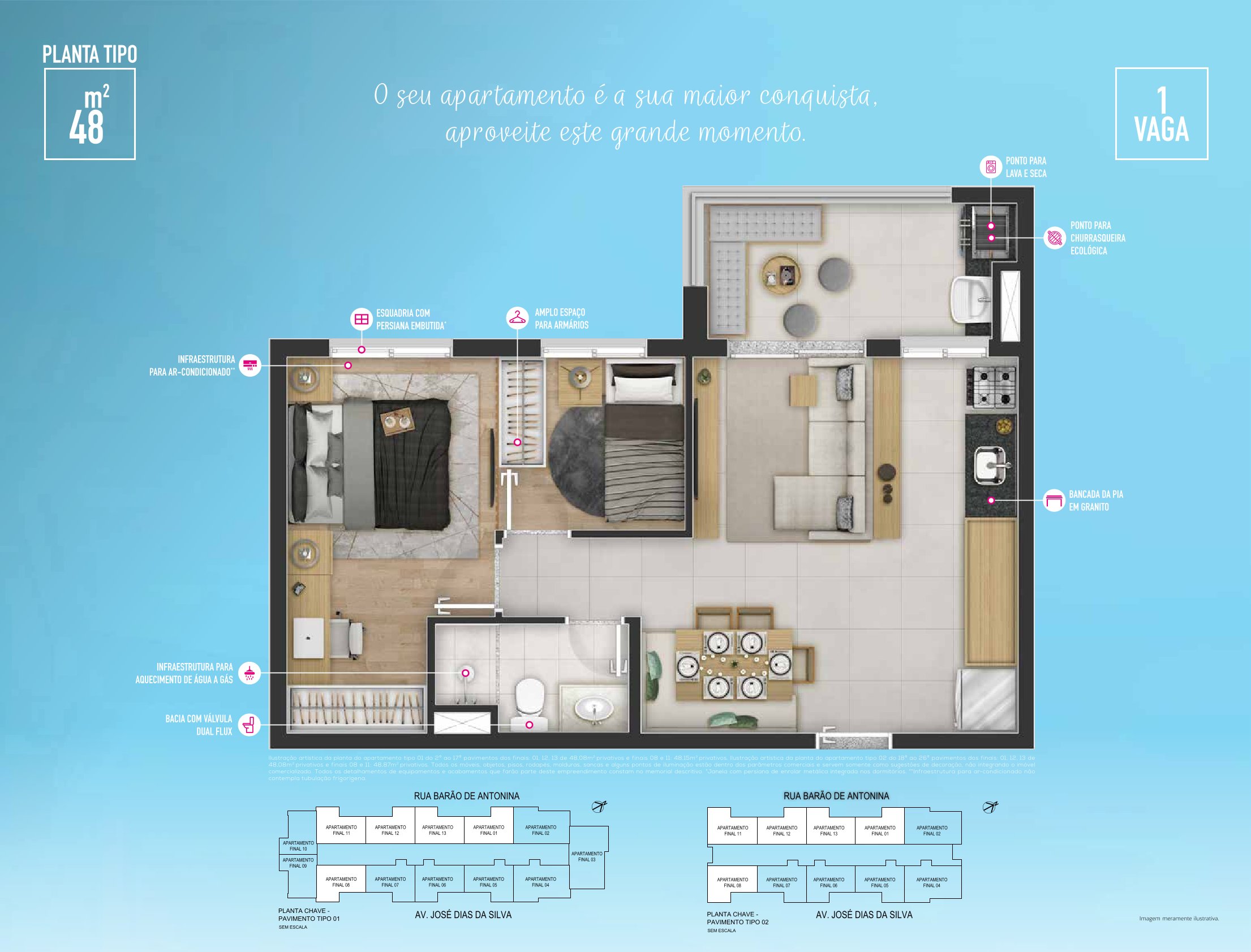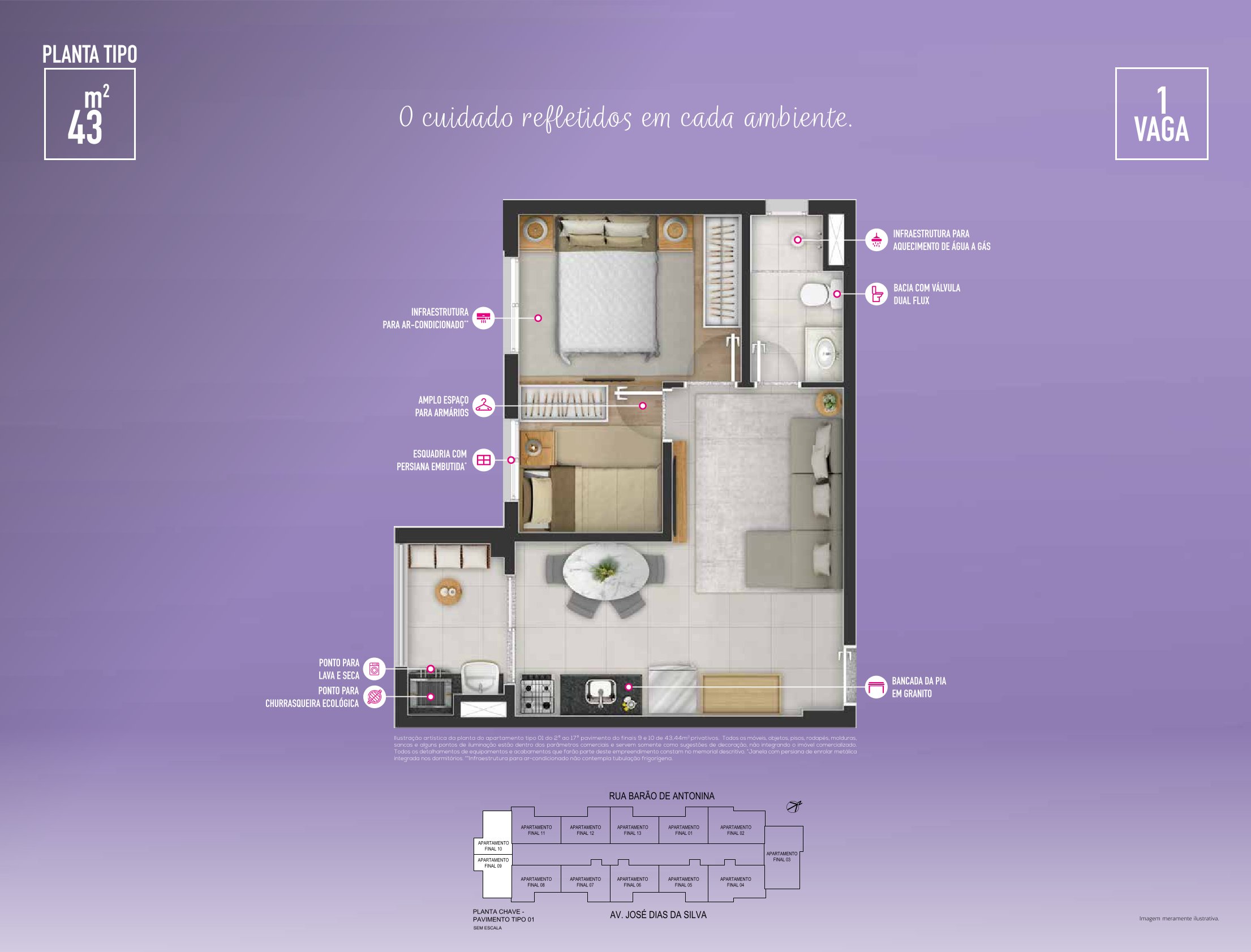 O apartamento de 43 m² foi projetado para quem busca praticidade, conforto e um excelente custo-benefício. Ideal para solteiros, jovens casais ou como primeiro imóvel.