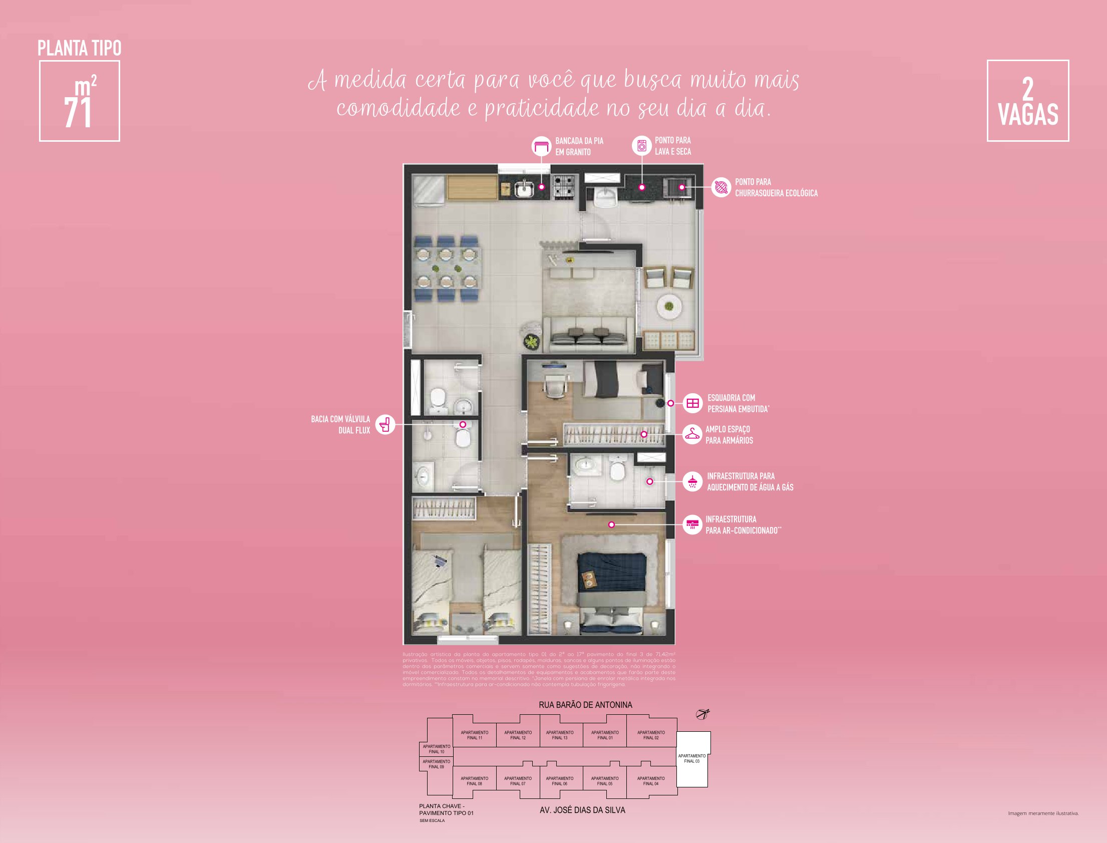 Se você procura mais espaço e conforto para toda a família, a unidade de 71 m² é a escolha ideal. Um apartamento moderno, com planta bem distribuída e ambientes que valorizam praticidade e bem-estar.